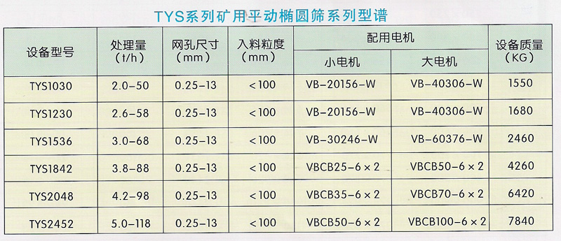 TYS系列礦用平動橢圓篩利用“單質體雙軸慣性振動篩力心理論”和“雙軸不等質徑積(矩)追隨自同步和同步狀態穩定性理論”,選用兩組不等質徑積比的振動電機做激振源,實現振動篩平動橢圓振動。